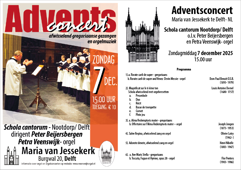 Op zondagmiddag 7 december a.s. (2e zondag van de Advent) om 15.00 uur is er in de Maria van Jessekerk te Delft een Adventsconcert. De Adventstijd is ingetogen, het is de periode van voorbereiding naar het Kerstfeest. Bij dit Adventsconcert zijn, naar oud Middeleeuwse praktijk, afwisselend gregoriaanse gezangen van een mannenkoor (Schola cantorum) en orgelmuziek te horen. De Schola bestaat uit 15 zangers en staat o.l.v. dirigent Peter Beijersbergen. Zij zingen de gregoriaanse hymnen uit de Advent; Rorate caeli, Magnificat, Alma Redemptoris mater, Salve Regina, Adorote devote, Ave Maris Stella. De zangers gaan voor de gelegenheid gekleed in toog en superplie.